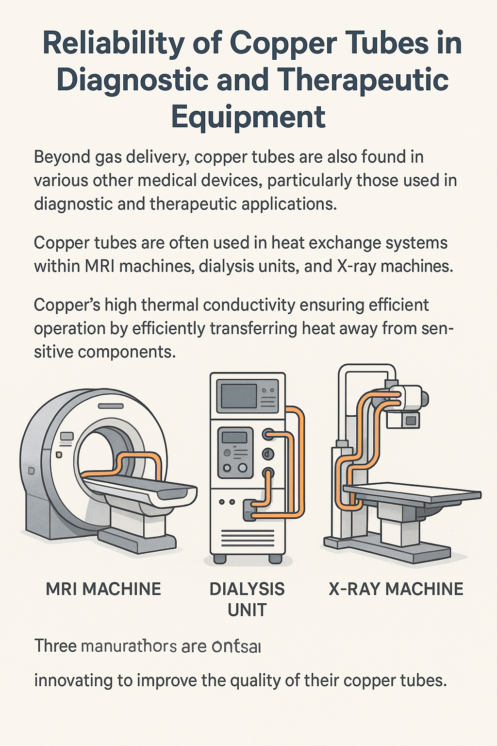 Osim isporuke plina, bakrene cijevi se također nalaze u raznim drugim medicinskim uređajima, posebno onima koji se koriste u dijagnostičke i terapijske primjene . Na primjer, bakrene cijevi se često koriste u sustavi za izmjenu topline unutar medicinske opreme poput MRI strojeva, jedinica za dijalizu i rendgenskih uređaja. Visoka toplinska vodljivost bakra osigurava učinkovit i siguran rad ovih strojeva učinkovitim prijenosom topline s osjetljivih komponenti.