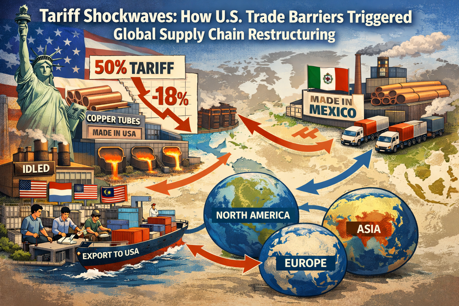 Podnaslov: Kada su SAD uvele carine od 50% na bakrene cijevi pokrenule restrukturiranje globalnog trgovačkog lanca, kako je proizvodni kapacitet u jugoistočnoj Aziji i Meksiku porastao za 46,3% u roku od godinu dana? Ova migracija opskrbnog lanca vođena politikom ponovno iscrtava mapu globalne distribucije vrijednosti za bakrene cijevi.