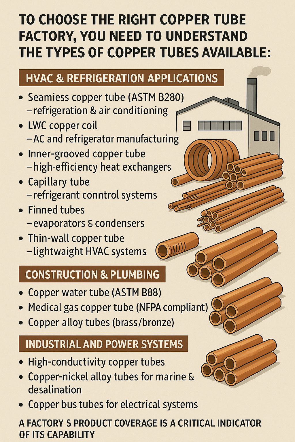 Tvornica može osigurati vrste bakrenih cijevi potrebnih za vaš projekt (npr. bešavne/zavarene cijevi, kapilarne cijevi, rebraste cijevi, cijevi kondenzatora/isparivača itd.) i podržavaju li prilagođene promjere cijevi, debljine i vrste legura.