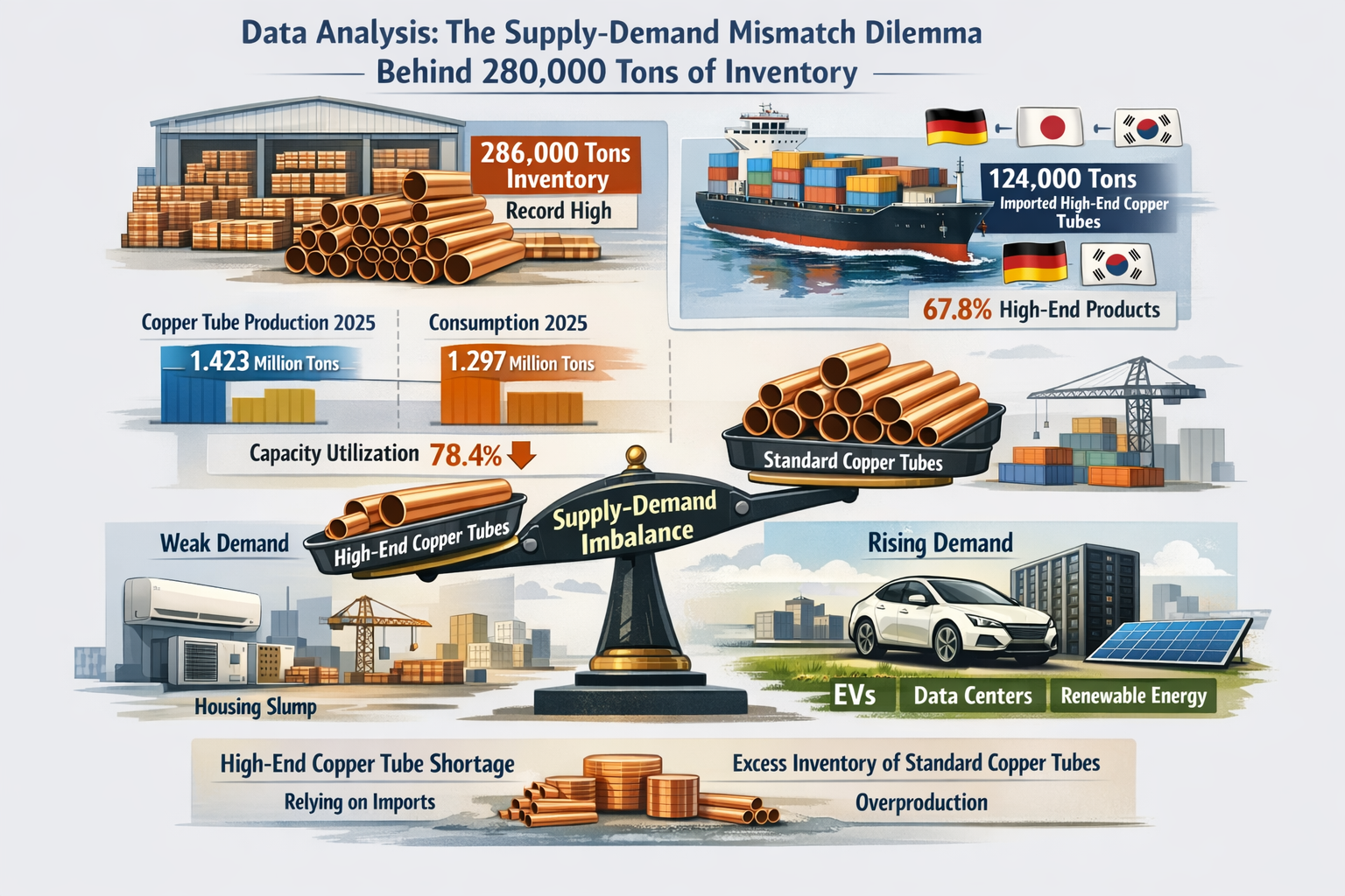 Najnoviji podaci Nacionalnog zavoda za statistiku i Kineske udruge industrije obojenih metala oslikavaju neravnotežu u kineskoj industriji bakrenih cijevi. U 2025. godini nacionalna proizvodnja bakrenih cijevi dosegla je 1,423 milijuna tona, međugodišnje povećanje od 6,8%, ali očita potrošnja u istom razdoblju iznosila je samo 1,297 milijuna tona, a stopa iskorištenosti kapaciteta pala je na 78,4%, što je smanjenje od 4,2 postotna boda u usporedbi s 2024. Na kraju ožujka 2025. inventar bakra cijevi velikih poduzeća za preradu bakra u Kini dosegla je 286 000 tona, novi rekord u gotovo pet godina, pri čemu zalihe u Istočnoj Kini čine čak 52,3%, ističući posebno istaknutu regionalna neusklađenost ponude i potražnje .