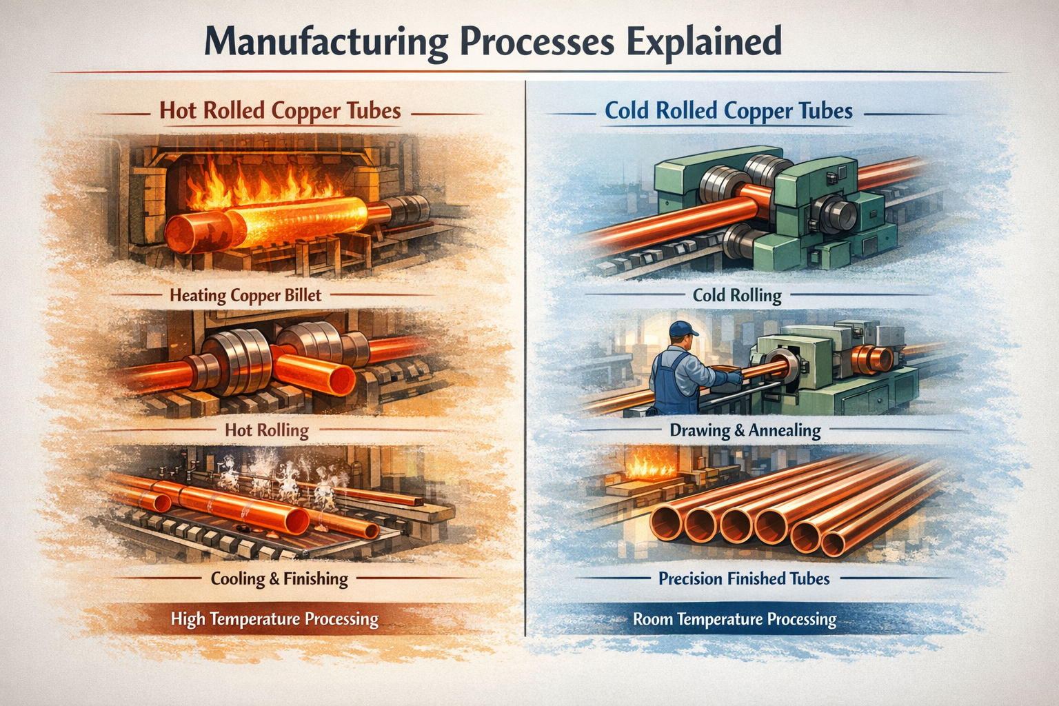 Proces proizvodnje je temelj razlika u performansama između hladno valjanih i toplo valjanih bakrenih cijevi. Kvalificirani tvornica bakrenih cijevi obično nudi obje opcije kako bi zadovoljio različite zahtjeve tržišta.