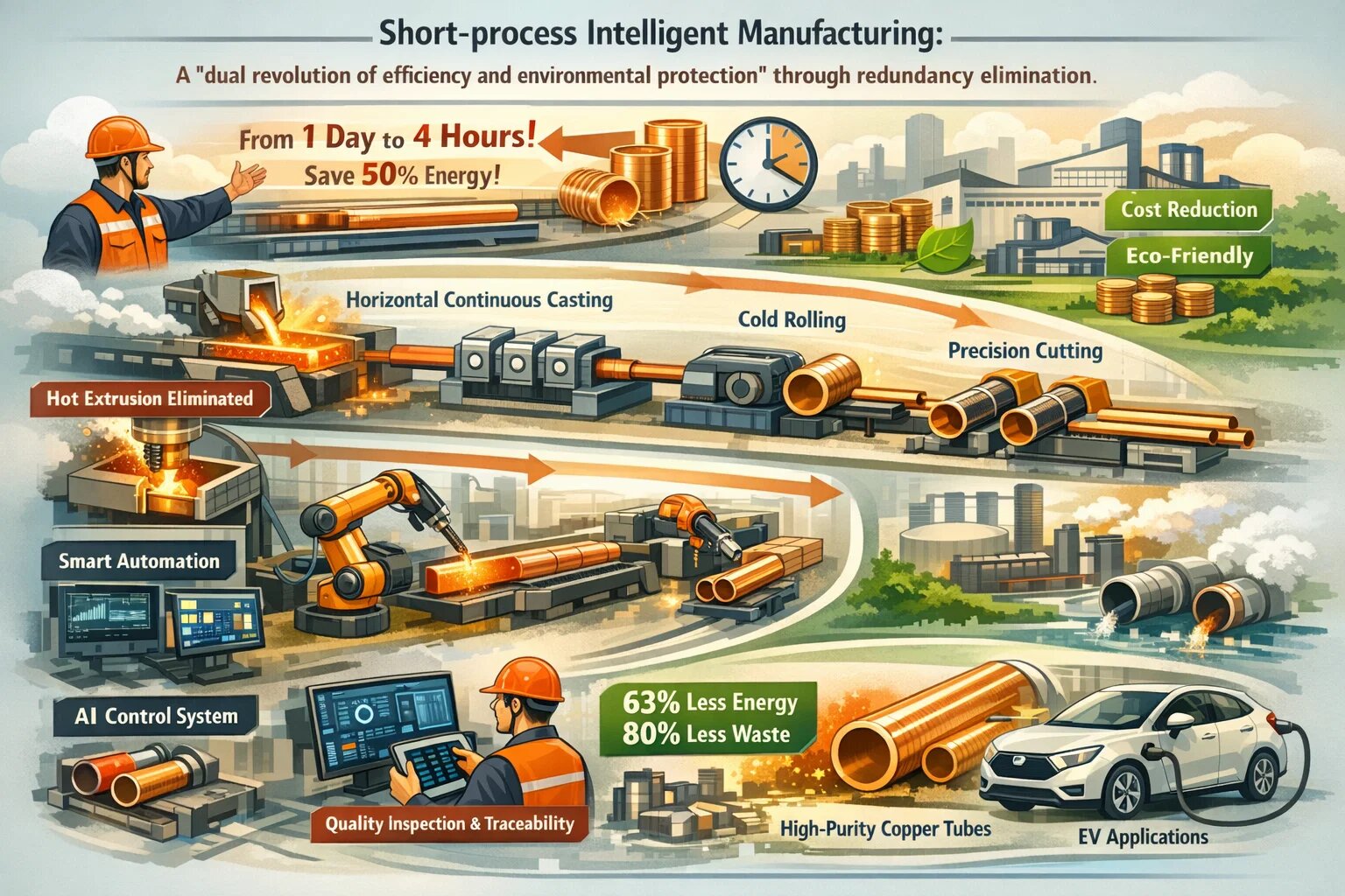 Srž buduće konkurencije bit će "prilagodljivost procesa": tvrtke će morati odabrati ključne procese na temelju pozicioniranja proizvoda, dok će istovremeno rješavati nedostatke kroz nadogradnju digitalne i zelene tehnologije. Tehnologije s kratkim procesima trebaju prevladati uska grla u proizvodnji cijevi velikog promjera i debelih stijenki, dok tehnologije s dugim procesima zahtijevaju kontinuirano smanjenje potrošnje energije i ekoloških troškova. Ova revolucija u proizvodnim procesima u konačnici će preusmjeriti industriju bakrenih cijevi od "natjecanja velikih razmjera" do "rafiniranog natjecanja temeljenog na preciznosti i učinkovitosti", formirajući dvostruku proizvodnu strukturu "vrhunske inteligentne opće robusne" proizvodnje.