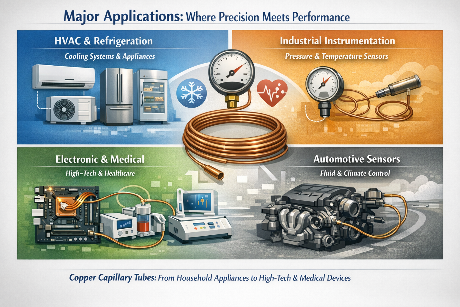 Zbog svoje sposobnosti da kontroliraju protok tekućine s iznimnom preciznošću, bakrene kapilarne cijevi nalaze se u svemu, od kućanskih aparata do medicinske opreme za spašavanje života.