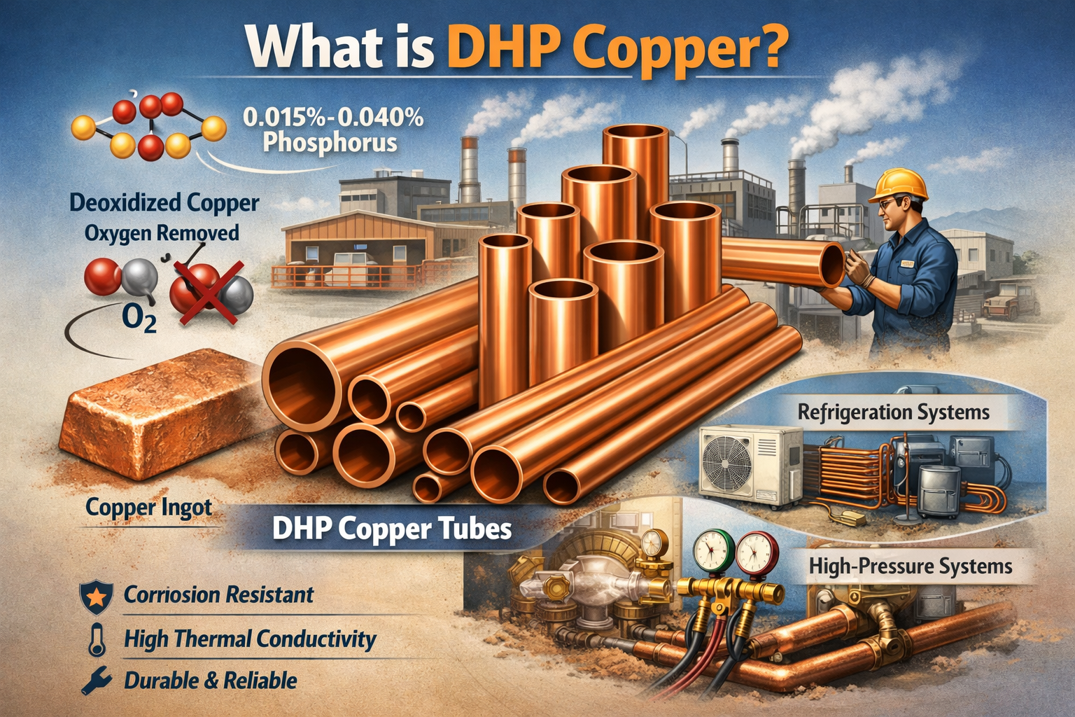 DHP bakar je visokokvalitetan, deoksidirani bakar legura koja sadrži malu količinu fosfora , obično između 0,015% i 0,040%. Primarna karakteristika ovog bakra je da je tretiran za uklanjanje kisika, proces koji poboljšava njegovu otpornost na koroziju i osigurava bolje performanse u visokotlačnim sustavima. Sadržaj fosfora dodatno poboljšava njegova svojstva, što ga čini idealnim za upotrebu u primjenama gdje su izdržljivost, toplinska vodljivost i čvrstoća kritični.