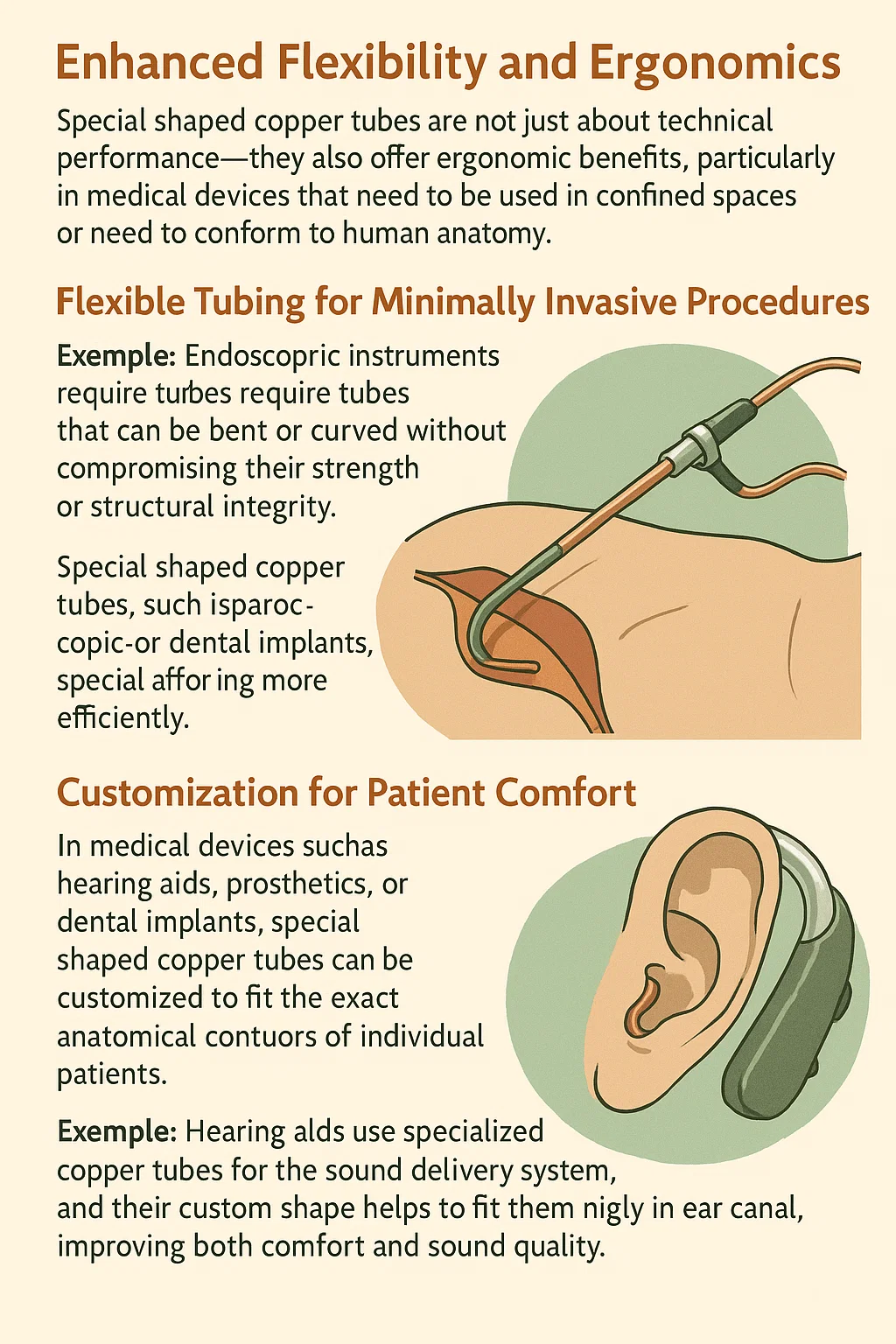 U medicinskim uređajima kao što su slušni aparati , protetika , ili zubni implantati , posebno oblikovane bakrene cijevi mogu se prilagoditi kako bi odgovarale točnim anatomskim konturama pojedinih pacijenata. Ova prilagodba poboljšava i udobnost i djelotvornost uređaja.