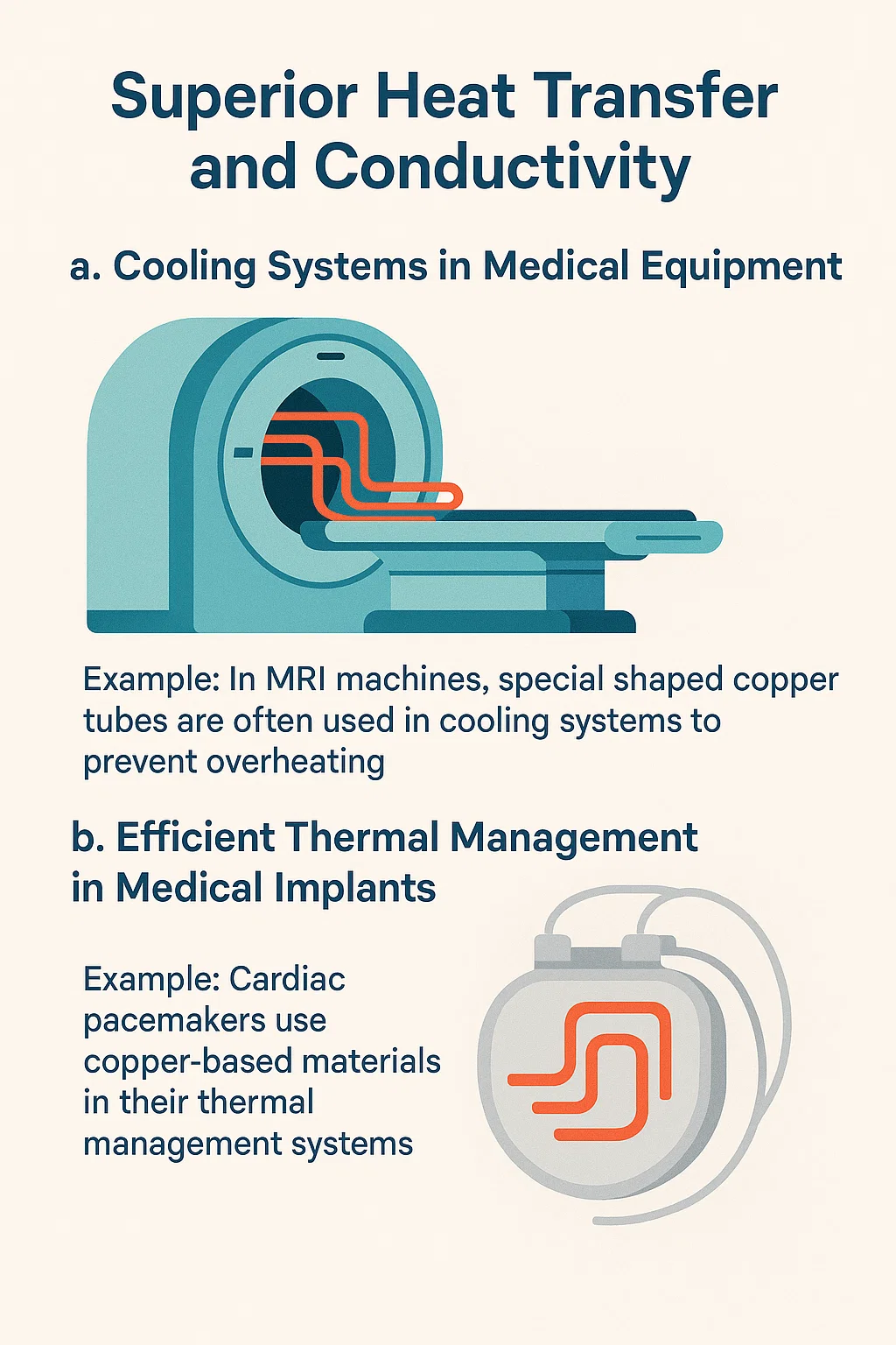 Bakar se također sve više koristi u implantabilni medicinski uređaji , kao što je pacemakers or neurostimulatori , gdje toplinska regulacija je bitno. Posebno oblikovane bakrene cijevi u ovim uređajima pomažu u upravljanju disipacijom topline, sprječavajući pregrijavanje osjetljivih unutarnjih komponenti.